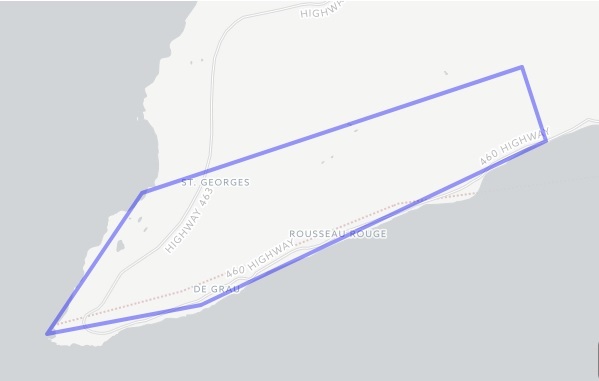 Kwesowaak is Mi'kmaq and means the end of the land. Also known as Cape St. George, it marks the entrance to St. George's Bay, which is south of the Port au Port Peninsula on the west coast of Newfoundland. Its 50-ft. cliffs loom over a lowland that extends to Marches Point, with today's community stretching from Loretto, along the south coast of the peninsula, to Cape St. George on the westernmost tip and including Marches Point, Red Brook, De Grau, Grand Jardin and Petit Jardin. Referred to by residents as le bout du monde. or "the end of the world", the Cape itself is a steep, rock beach battered by strong tidal streams and surf.